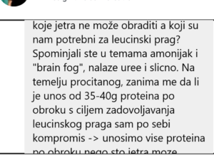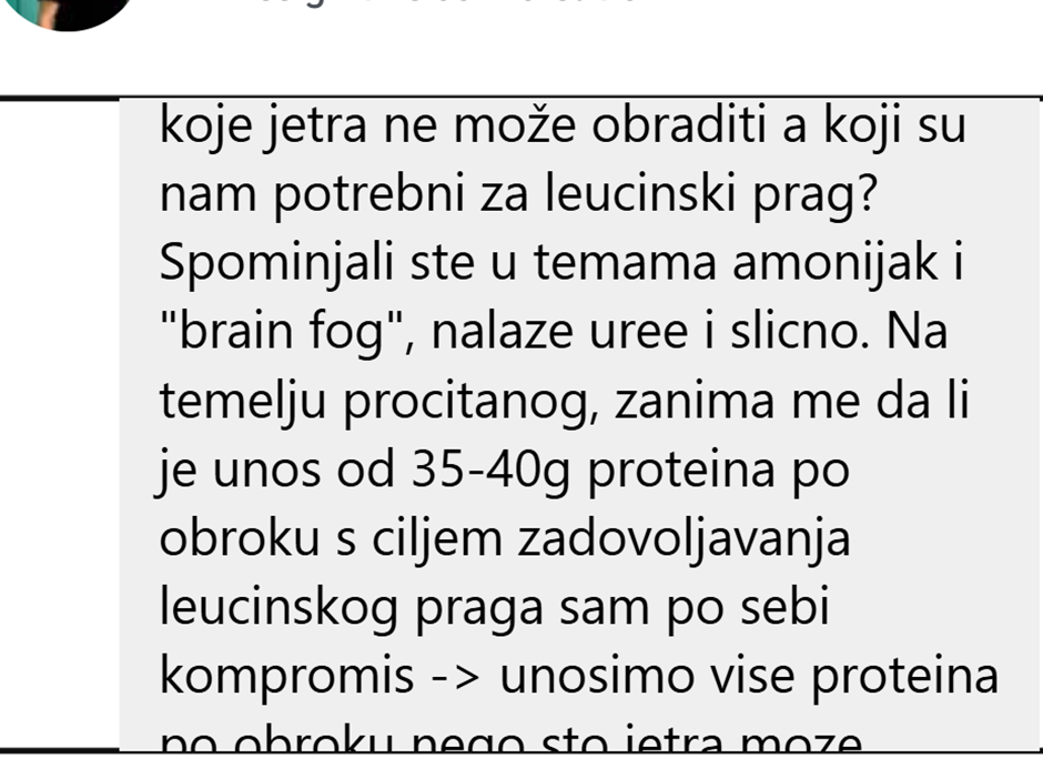 1) Pisali ste da jetra može obraditi 25g proteina odjednom. Da bi smo zadovoljili leucinski prag i dali signal mTOR-u za paljenje moramo unijeti 35-40g grama proteina uz visokokvalitetnih izvora. Znači li to da mi zapravo unosimo 10-15g proteina više nego što jetra može obraditi samo zato da bi tom količinom postigli leucinski prag? Što se događa s tih preostalih 10-15g koje jetra ne može obraditi a koji su nam potrebni za leucinski prag? Spominjali ste u temama amonijak i “brain fog”, nalaze uree i slicno. Na temelju procitanog, zanima me da li je unos od 35-40g proteina po obroku s ciljem zadovoljavanja leucinskog praga sam po sebi kompromis -> unosimo vise proteina po obroku nego sto jetra moze procesuirati kako bi smo poticali aktivaciju mTOR-a?